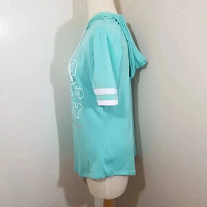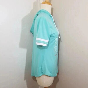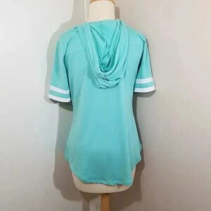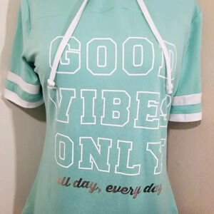 EUC: Cool Hooded Top bu Infinite Performance. Mint Green and White. "Good Vibes Only". SIZE SMALL. Measurements (flat): Bust 18", Length 28". Location: K-0248