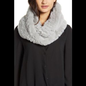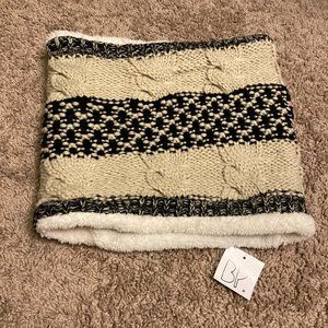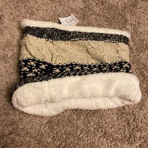 NWT Infinity Scarf Cream and Black chunky cable knit on outside, white faux fur on inside. 13" opening laid flat. 11" top to bottom.