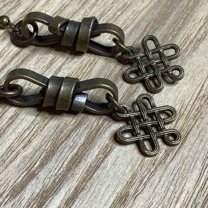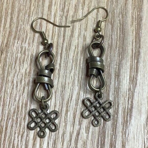 These are beautifully designed brass wrapped chain links with infinity charm pendants. The bulk of the link offsets the graceful infinity symbol. Length is 2.5”. Nickel free ear wires.