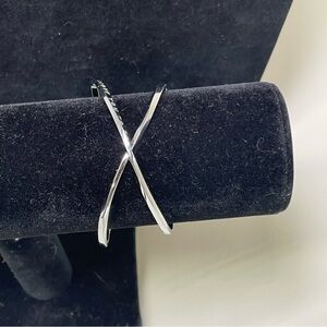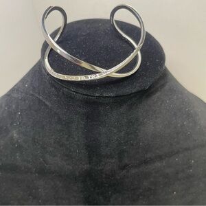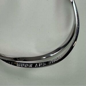 This stunning silver tone infinity cuff bracelet adds a touch of elegance to any outfit. It has “I Love You To The Moon And Back” printed on the exterior of cuff. Perfect for any occasion. Excellent preowned condition.