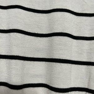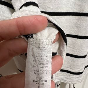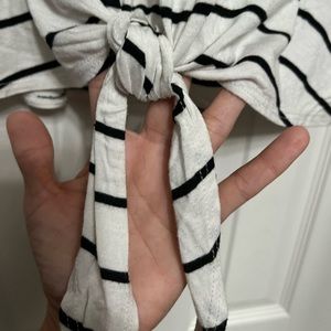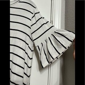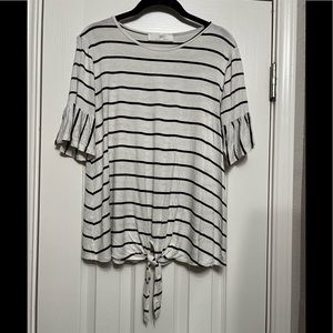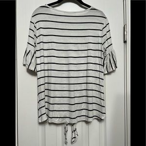 Ivory/Black Striped tie front ruffle sleeve shirt sleeve top. Features a round neck and a tie front.