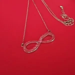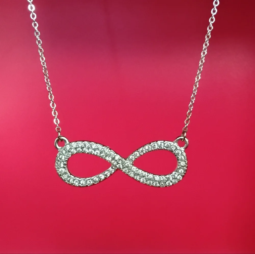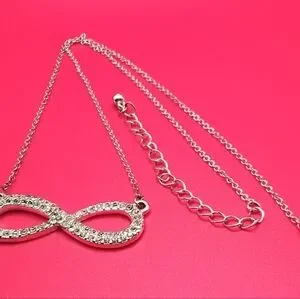 Infinity Rhinestone Necklace A Beautiful Necklace Featuring an Infinity Design Set with Sparkling Rhinestones. 8" Chain on both sides of Pendant 1.75"w