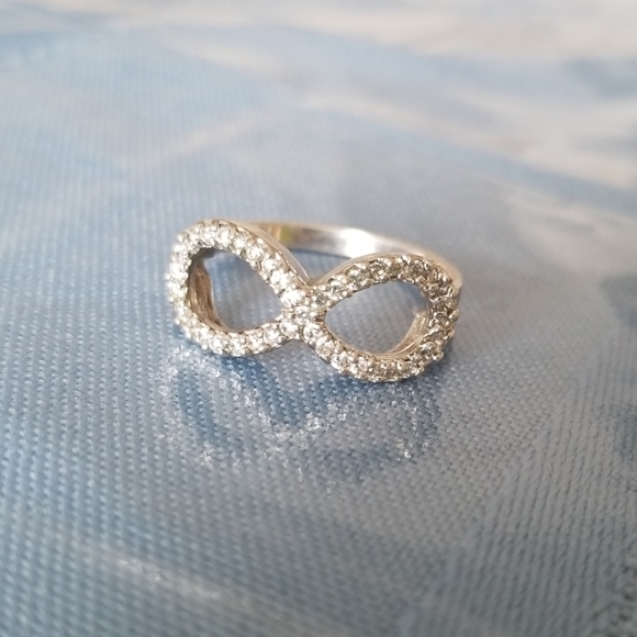 Silver tone with rhinestones in the infinity sign shape. Not sure of exact size, but I think a 7. Never worn. Still sparkly.