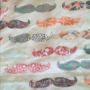100% polyester infinity scarf, 30" x 70". Has a pastel mustache pattern.