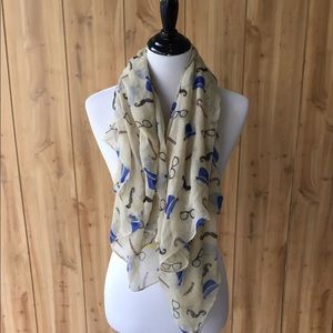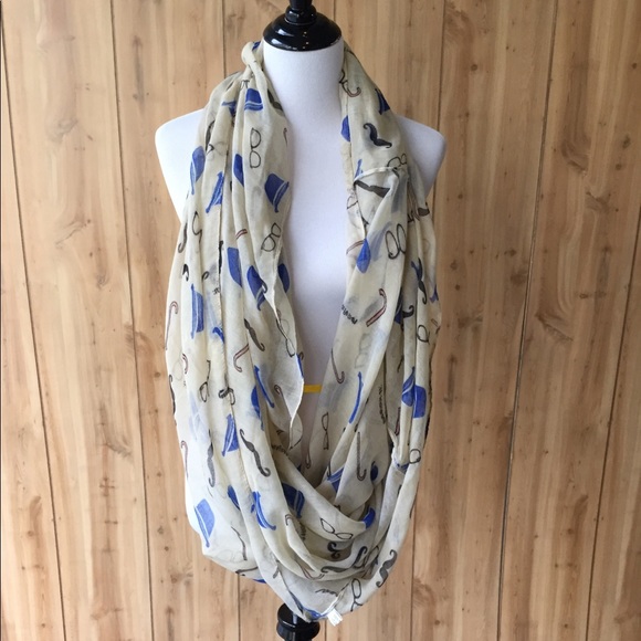 Cream colored infinity scarf with mustaches, top hats, canes and glasses on it.