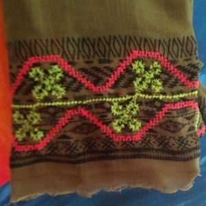 Green infinity scarf with neon pink and green stitching, and black design print. Frayed edges. I'm also not set on any of my prices necessarily so let me know if another price might work better.