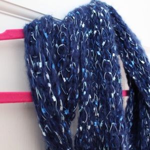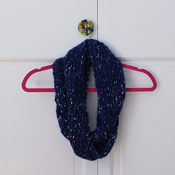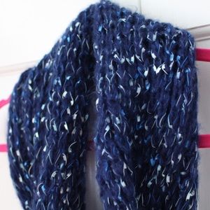 A blue knit infinity scarf.