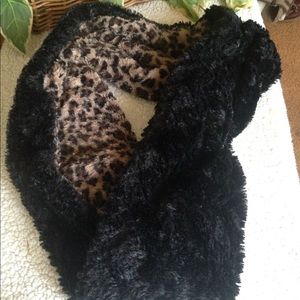 This is a beautiful two toned faux fur black and leopard print infinity scarf. It's 66" in length, reversible, hand washable and super soft. This polyester scarf is a perfect addition for those cold days.