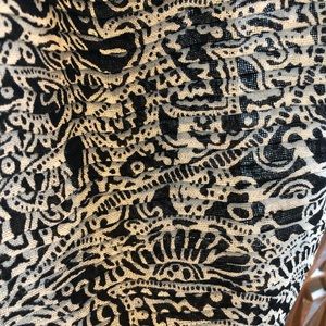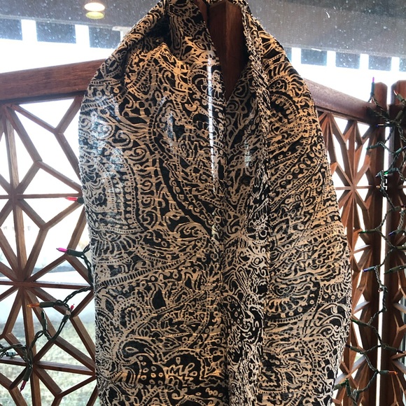 Lightweight infinity scarf. Black and white (the white is not super white.) great addition to those who love to wear black! I don’t know the brand.