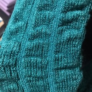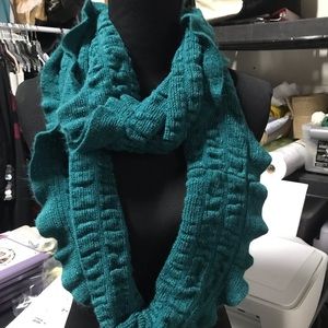 Teal with tinsel infinity scarf with a scalloped ruffle around the edge. Stretch fabric and can be worn a bunch of different ways. I only used it a few times and it has been laundered and in great condition!