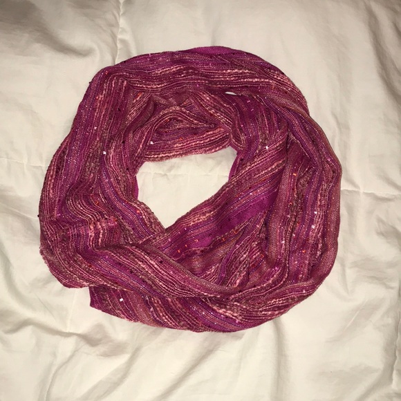 This is a fancy hot pink light weight infinity scarf. It has light pink, red, and silver plus gold metallic threads running through it for a very pretty exotic look. This accessory would be ideal for livening up any outfit.