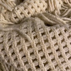 The scarf is Ivory with Gold throughout the whole scarf as well as in the fringe