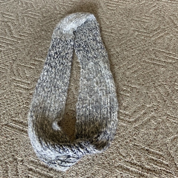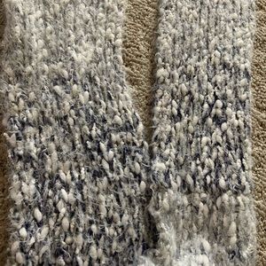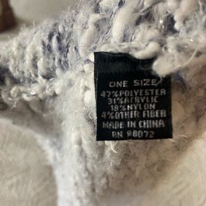 Very fluffy and very soft! A mixture of blues whites and grey. Keeps you very warm and adds a little bit of spice to outfits!