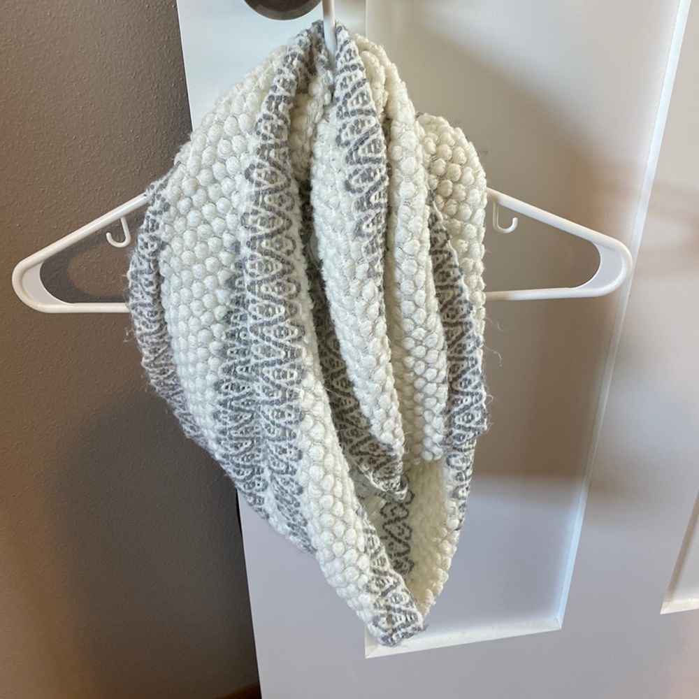 Cream colored infinity scarf with grey detailing! Vanity brand.