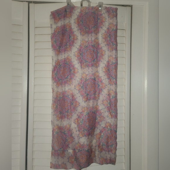 Super soft and dressy infinity scarf. It has beautiful floral mandala designs, with vibrant colors on a cream background. The item is cross listed