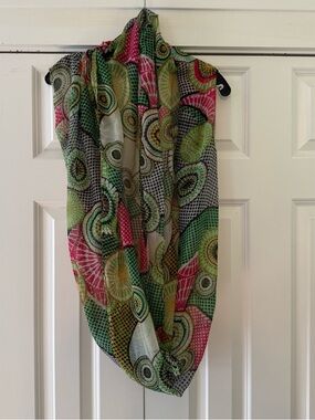 Thin material infinity scarf with hues of pink, green, yellow, and black