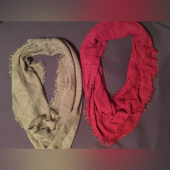 These stylish scarfs are so soft and warm. The scarf colors are olive green and burgundy. They are gently used and in great condition. The only flaw is a snag in the burgundy colored scarf. This is hardly noticeable and would be easily fixed by just cutting the string of the snagged portion. Please see picture for more detail.
