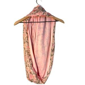 This charming infinity scarf showcases a delightful floral pattern on a pink on a gray backdrop. Crafted from lightweight fabric, it drapes beautifully, adding a touch of elegance to any outfit. Perfect for accessorizing in any season, this scarf is a versatile addition to your wardrobe.