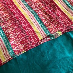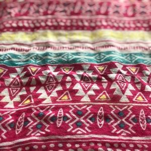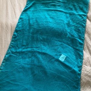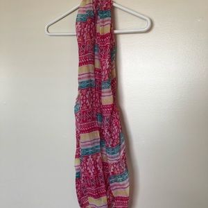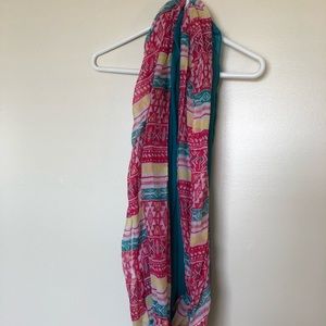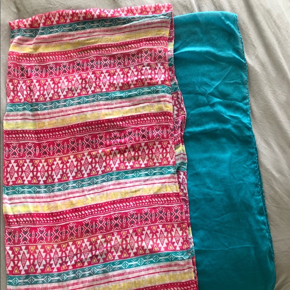 Two infinity scarves, made with 100% polyester. One has coloring including pink, yellow and a blue/green geometric print, and the other is solid blue/green. Can be worn together or individually! They are pre-owned and do have some signs of previous ownership but nothing that’s noticeable while wearing.