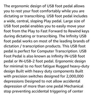 Infinity USB Foot Pedal for use in transcription. Brand new in box. Purchased for a class that I didn't end up taking. Sells on Amazon for $65.