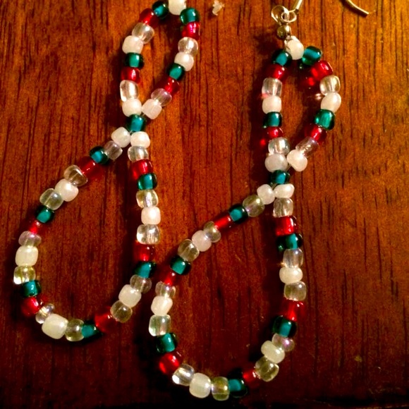 Handcrafted Infinity czech beaded earrings in blue, red, and white. Approximately 3in in length. Silver plated earring hooks.