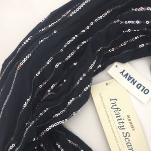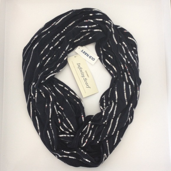 Navy blue infinity scarf with silver embellishments. Perfect for dressing up a casual t-shirt and jeans. Classic style.