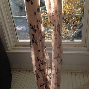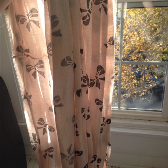 Long baby pink infinity scarf with black bow design. Perfect for fall weather!
