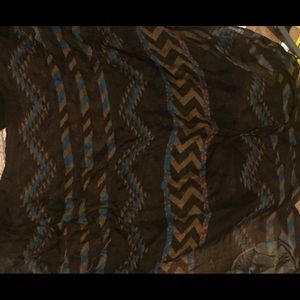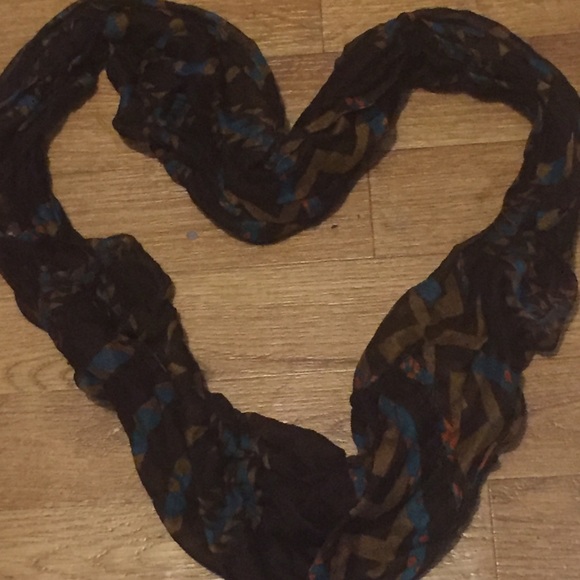 Brown infinity scarf with turquoise brown and orange triangular patterns