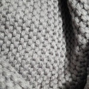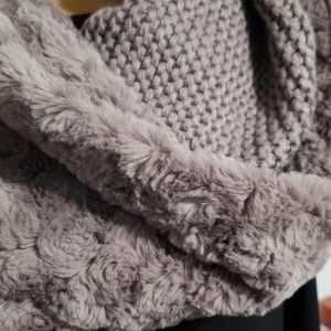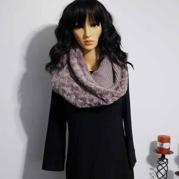 Infinity scarf. Knit on one side and small rose bud design in a plush ultra soft cozy fabric. There is no name. Can be word different ways.. light gray