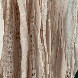 Light material—good for spring and fall. Light pink or light peachy pink color. Pattern gives texture and interest to piece. Pairs great with white, tan, black, gray and more.
