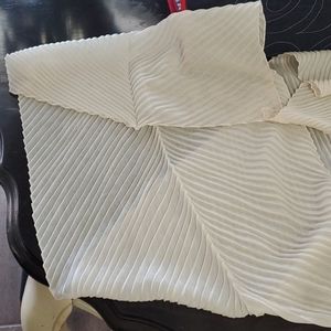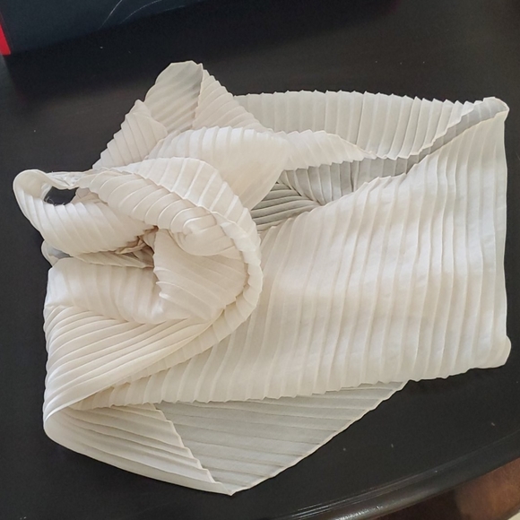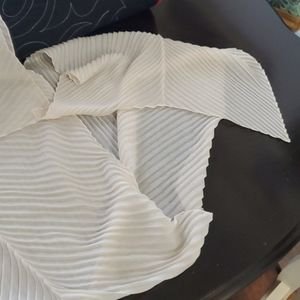 Cream pleated infinity scarf. On part is small where connects making it comfortable to wear. It isnt bulky. Super light. Perfect as an accessory!