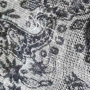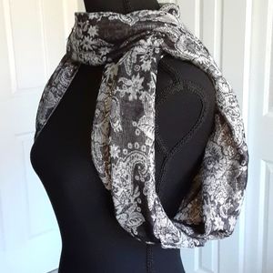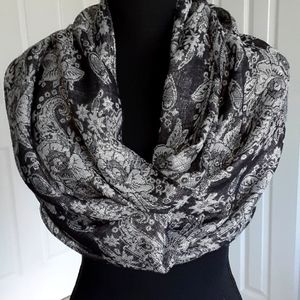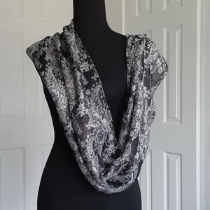 This infinity scarf is 40 inches long and 14 inches wide, with a floral pattern. The complementing grey and black color is highlighted by silver thread throughout. There are some loose threads as shown in pic #7.