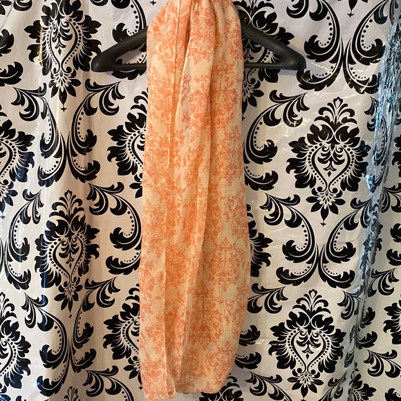 Sheer damask print infinity scarf. Pink design on cream background. Flaw in inking shown in pic (not a stain), but can be concealed once wrapped.