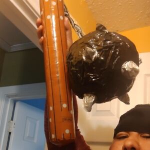 Fun inflatable mace and bat set. Perfect for costumes or parties. Features black and orange colors.