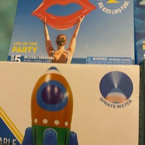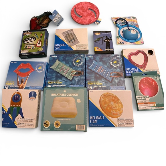 Set of colorful inflatable pool floats. Includes various shapes and designs. Perfect for pool parties. One dive toy set and a saucer. 14 pieces in all. Brand new in the boxes. Originally $65