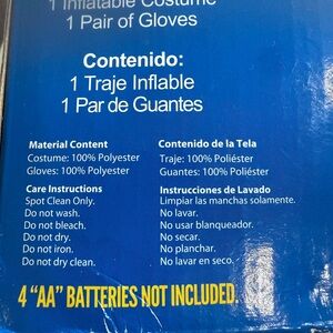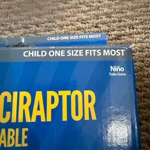 Unleash your inner dinosaur with the Inflatable Velociraptor Costume & 1 pair of gloves. NWT NEVER WORN. Fits up to 5’1”. CHILD ONE SIZE FITS MOST. This blue costume is perfect for reptile enthusiasts and costume parties. Easy to inflate and comfortable to wear, it's a fun addition to any event. UNISEX SFPF HOME