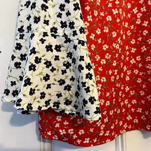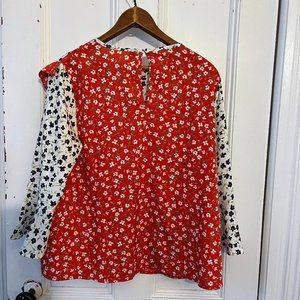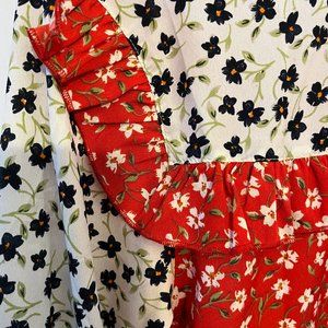All-over floral print, ruffle trim, three-quarter-length flared sleeves. Single-button closure in the back. Regular fit UK 12 (US 8). 100% polyester. 24" long, about 20" pit to pit. Pristine condition!