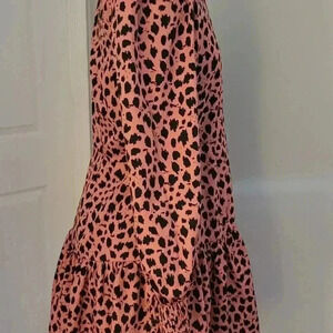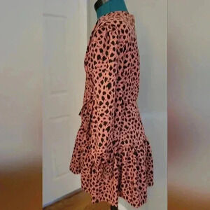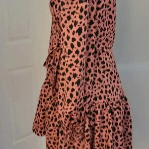 Good Used Condition. Pink Leopard print dress with black spots. Size 12 UK (US 8) Wrap Dress with bow closure and button clasp. Long sleeves with elastic on wrists. Tiered skirt hits mid-thigh. Smoke Free Home.