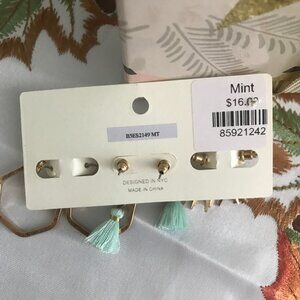 Hexagon hoops approx. 1 in. diameter and mint tassels are approx. 1 in. vertically