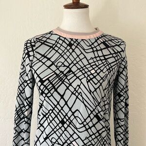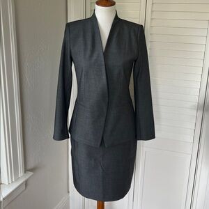 Black slacks in a soft material with subtle pinstripes. Two hip pockets and optional zip openings at ankle. Good used condition with normal signs of wear.
