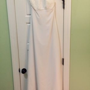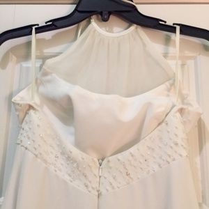 THIS IS A BEAUTIFUL INFORMAL WEDDING DRESS IN A WHITE POLY CHIFFON WITH PEARLS AND CRYSTALS IN A SIZE 4