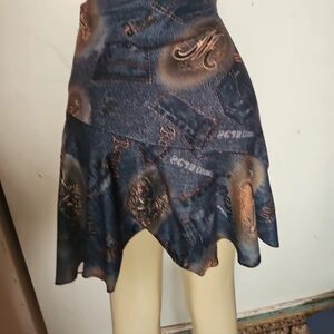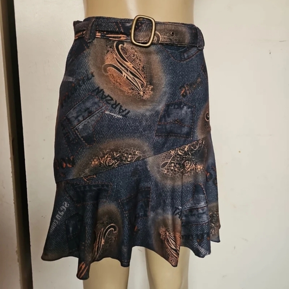 Chic mini skirt with a unique pattern. Features a stylish belt. Ideal for casual wear.