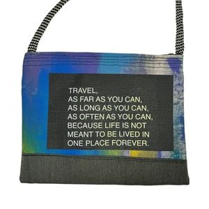 Inga & Evija Handmade Travel Crossbody Bag Purse. Lightweight mixed textiles fabric bag. zipper top closure. Lined. Front has a travel quote patch.