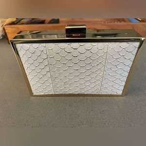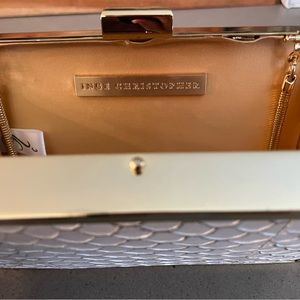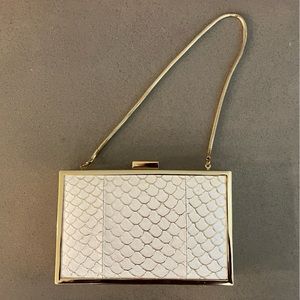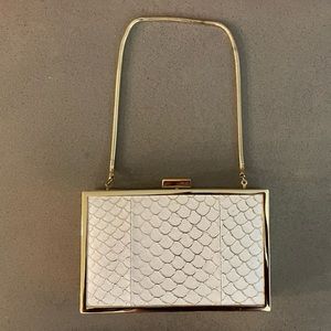 Inge Christopher white Corsica clutch evening purse. Satin lining that includes chain that can be tucked into clutch. The tilapia leather is accented with gold color. Gold colored metal frame with a rectangular clasp. Excellent preowned condition, no tears, smoke free home.