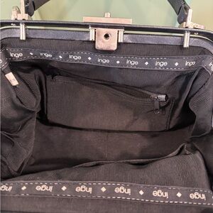 Gorgeous vintage satchel by Inge. Leather and Crystal appliqué on front. Snap close. Zip pocket inside. Four feet on bottom. Super soft quilted material. Leather strap and piping along purse. She’s a Beauty!