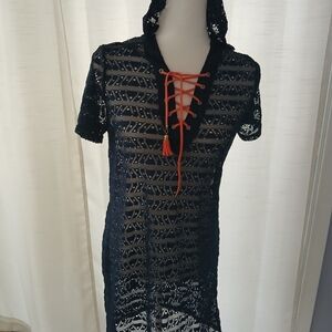 Hooded Cover Up with adjustable drawstrings criss cross front V-Neck.
