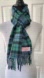 This 100% lambswool scarf by Ingles Buchan features a green, blue and black tartan plaid print with a varied-tone fringe hem and luxurious soft feel. Made in Scotland. Unisex wear.