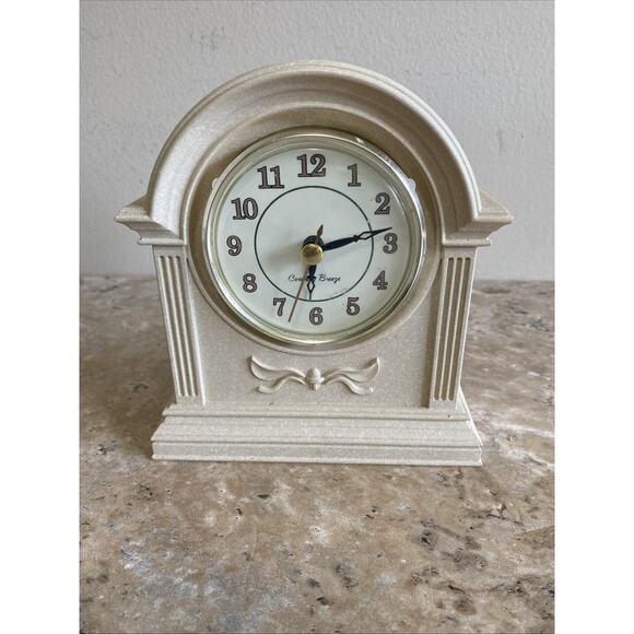 The Ingraham Ivory Mantel Desk Clock is a vintage Art Deco style piece measuring 6"x5" with a rectangular shape and ivory finish. It is battery-operated with a quartz movement, making it functional and accurate. The desk clock features a ceramic frame with a cream color and is branded by Ingraham, adding to its charm. Perfect for any room, this original piece from the late 20th century is a decorative collectible that works great as a stylish and practical addition to any space.