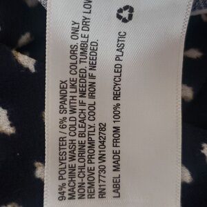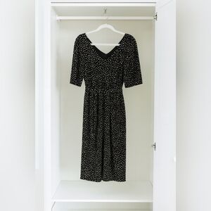 Woman's Size Large Maternity navy blue midi dress Comfortable Stretch white polka dots flattering V-neck three-quarter sleeves perfect for versatile styling Business Casual Slip-On Pullover Washable Comfortable Gently Pre-Loved Travel Vacation Career Office Casual Minimalist Modern Chic Stylish