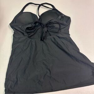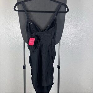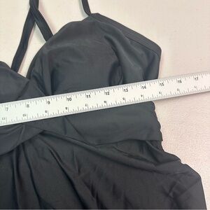 Stylish black swim dress with a unique knot feature. Ideal for versatile wear.